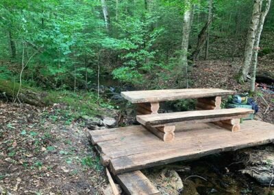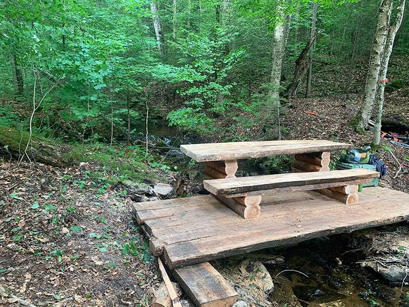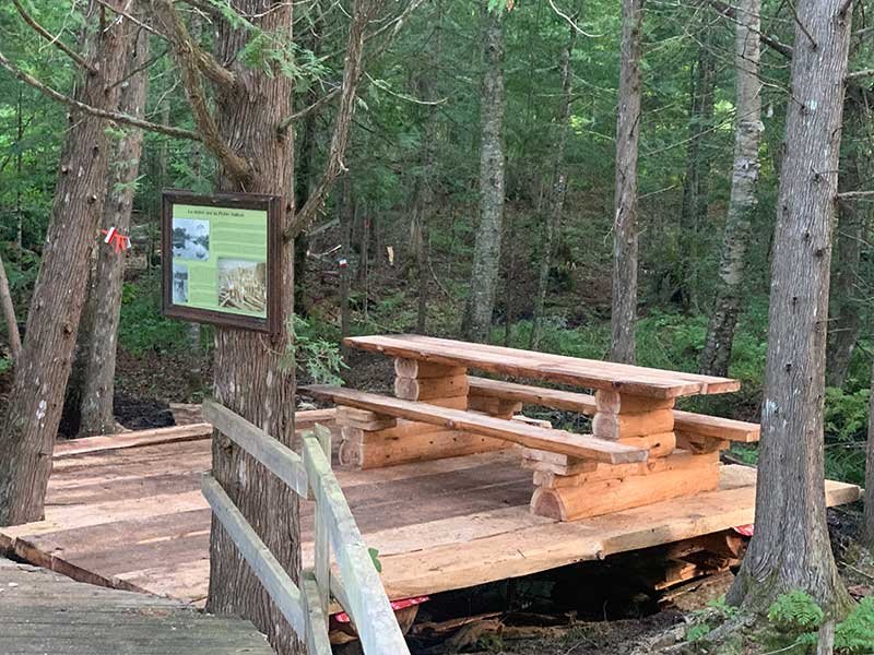 7. P8 – Cette section poursuit le parcours jusqu’à une petite chute et un ruisseau, franchis par un pont avec une table de pique-nique intégrée. Elle mène également au site de camping Marie-Le Franc.
